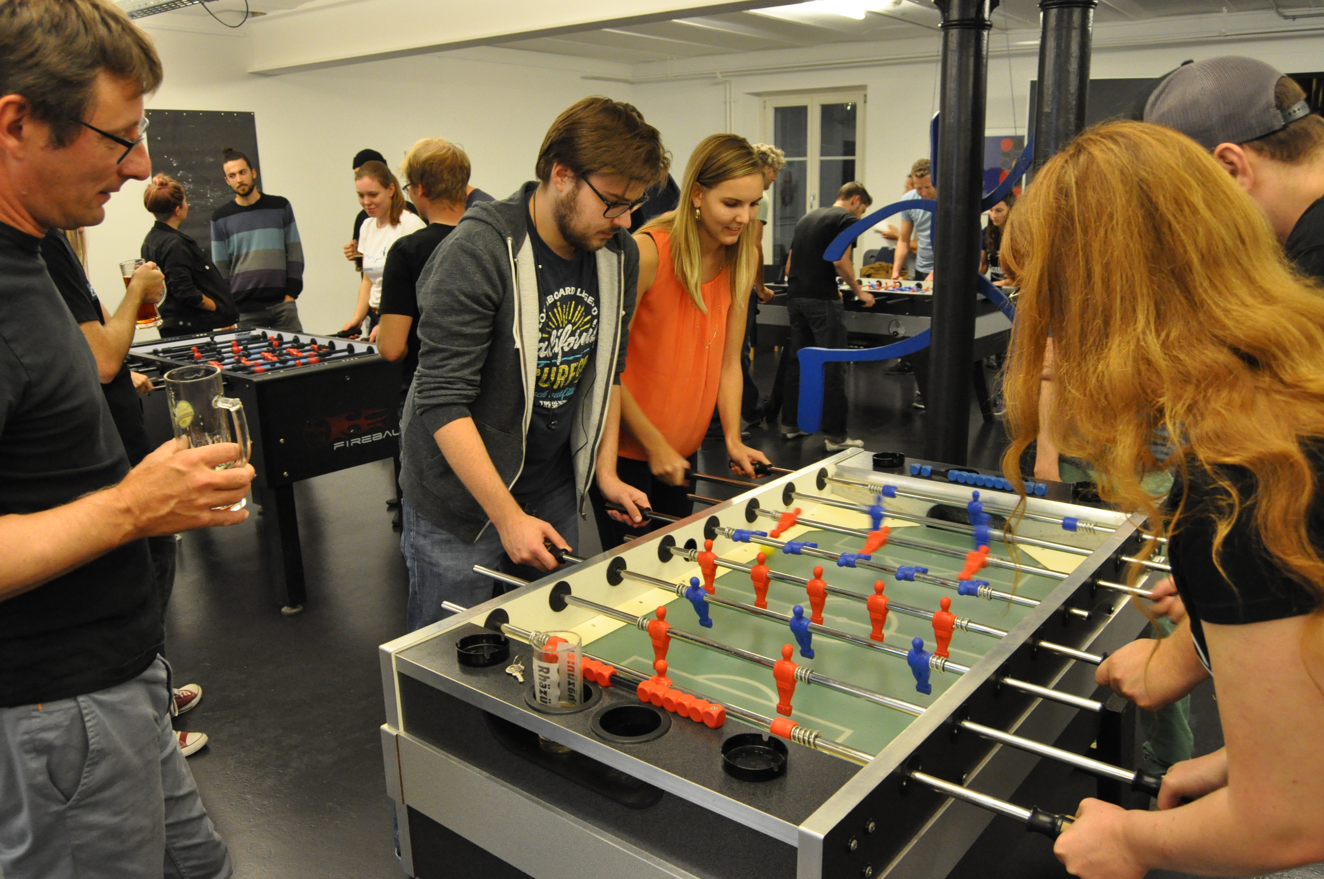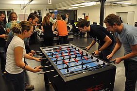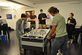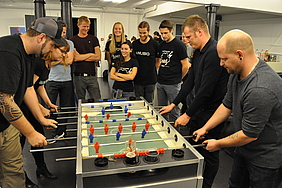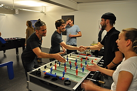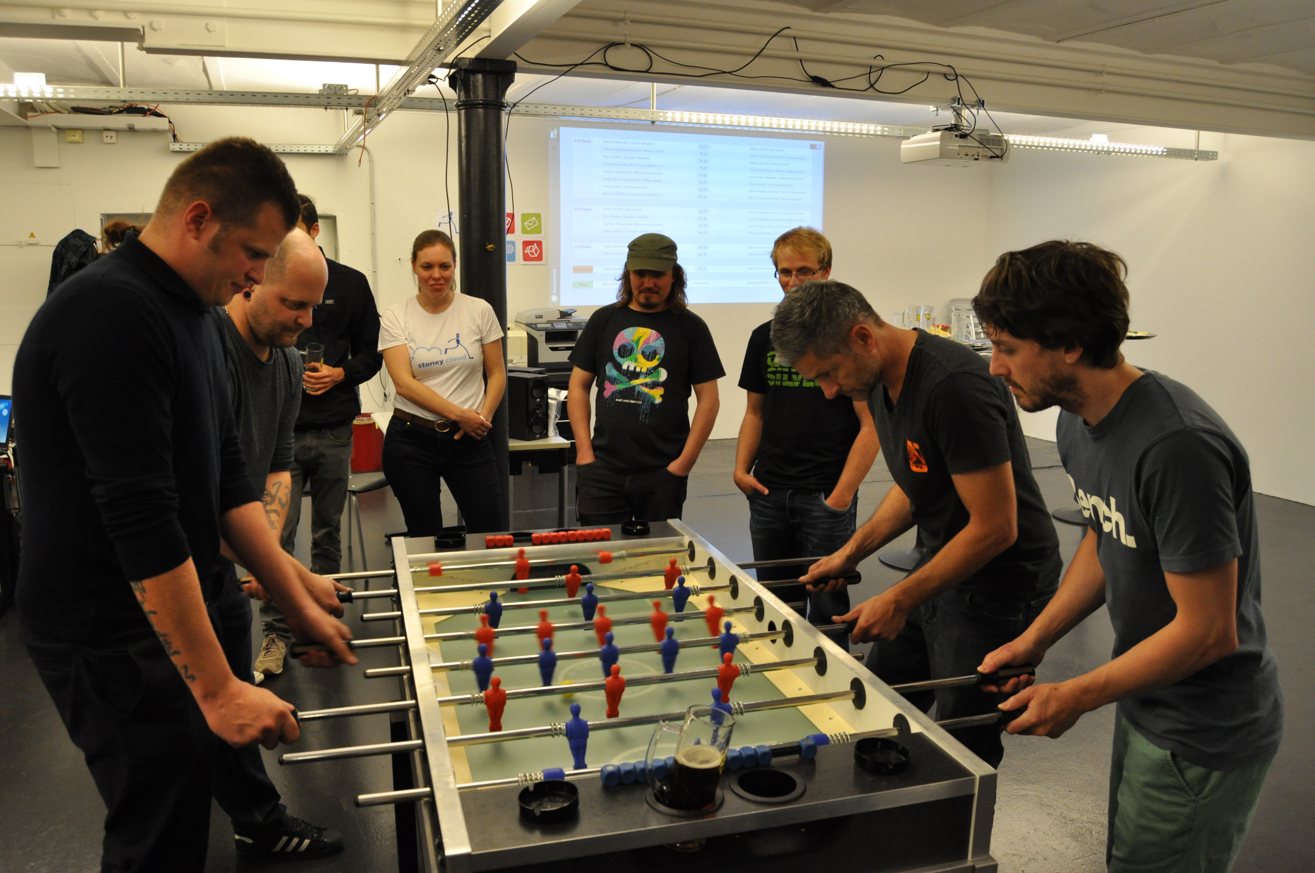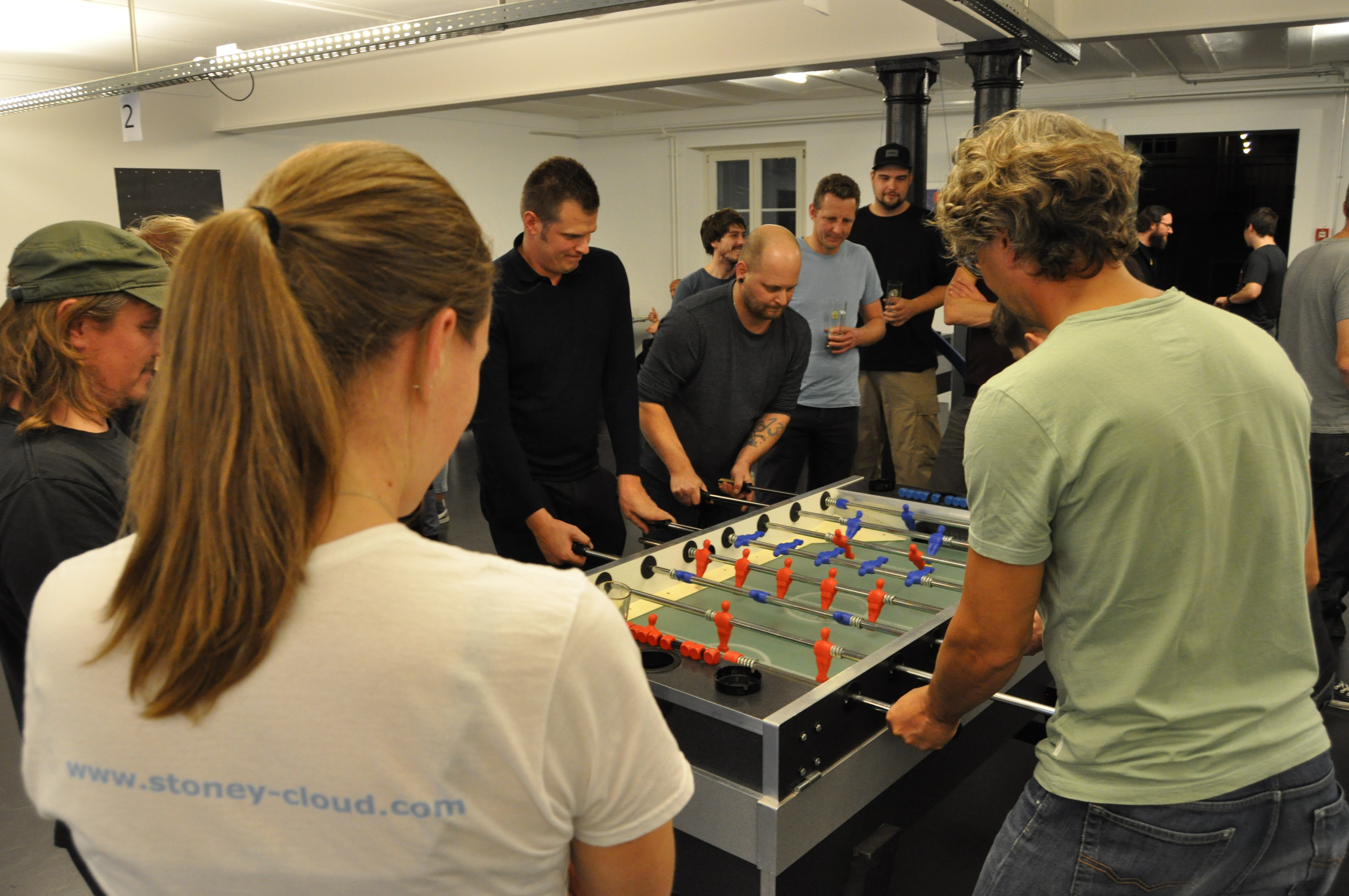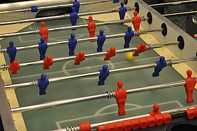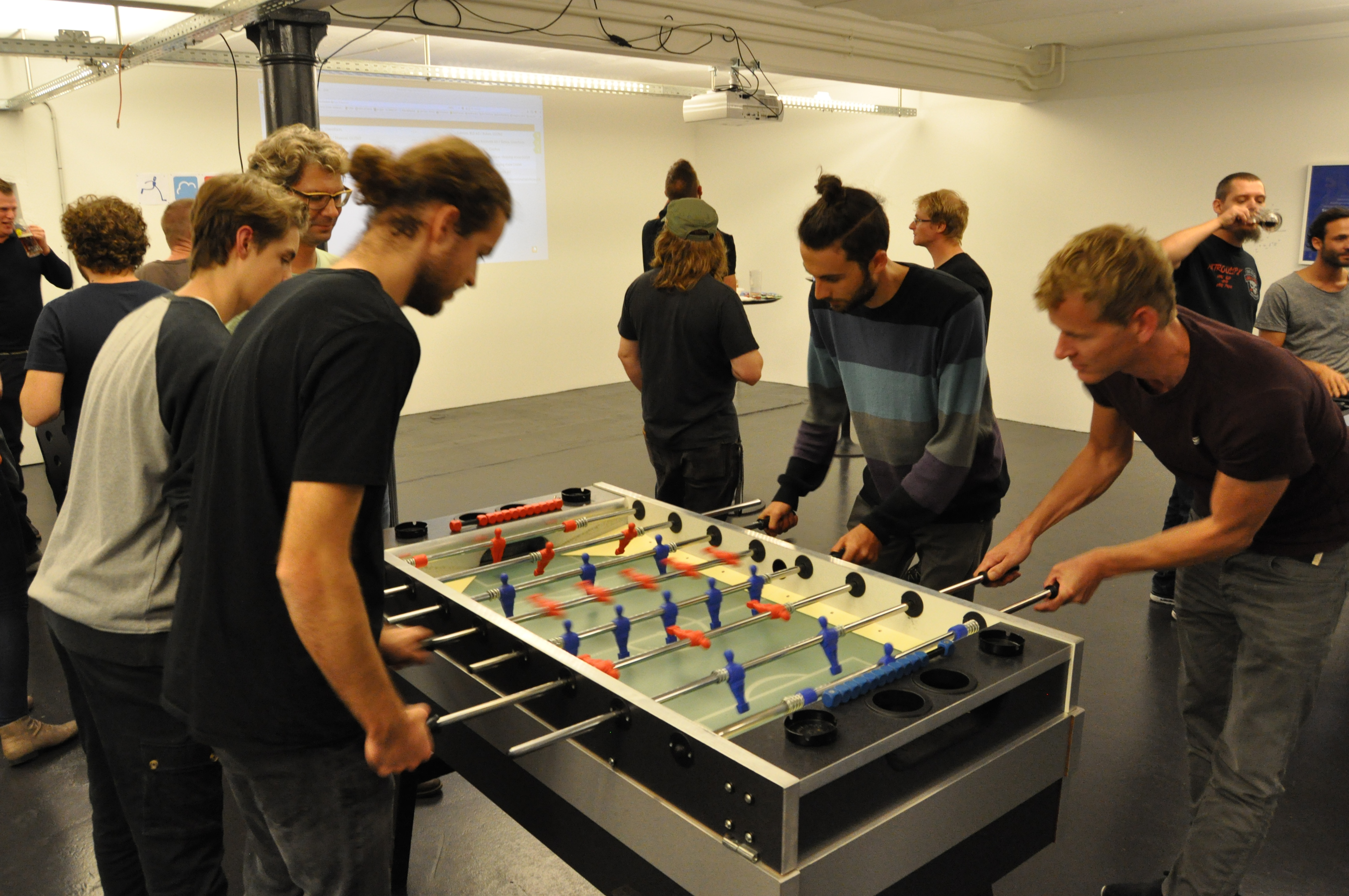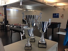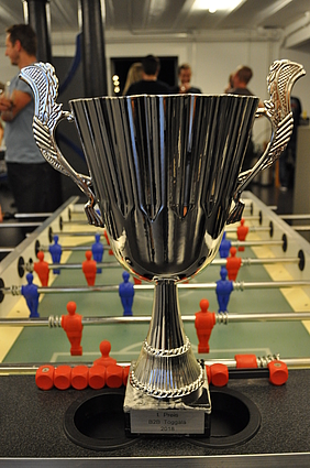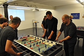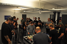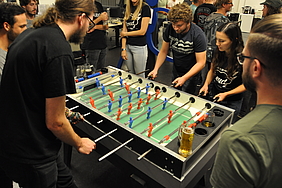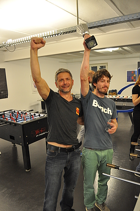 Organised by the companies Giessform Atelier für Kommunikationsdesign GmbH and stepping stone GmbH, the second business to business table football was a success. With over 30 participants from 20 companies the games started at 18:30 h. With 3 tables the tournament went into the first round. The teams were put together by a random generator every round. Exciting games and hot dogs turned the event for fans and spectators into an interesting evening as well.