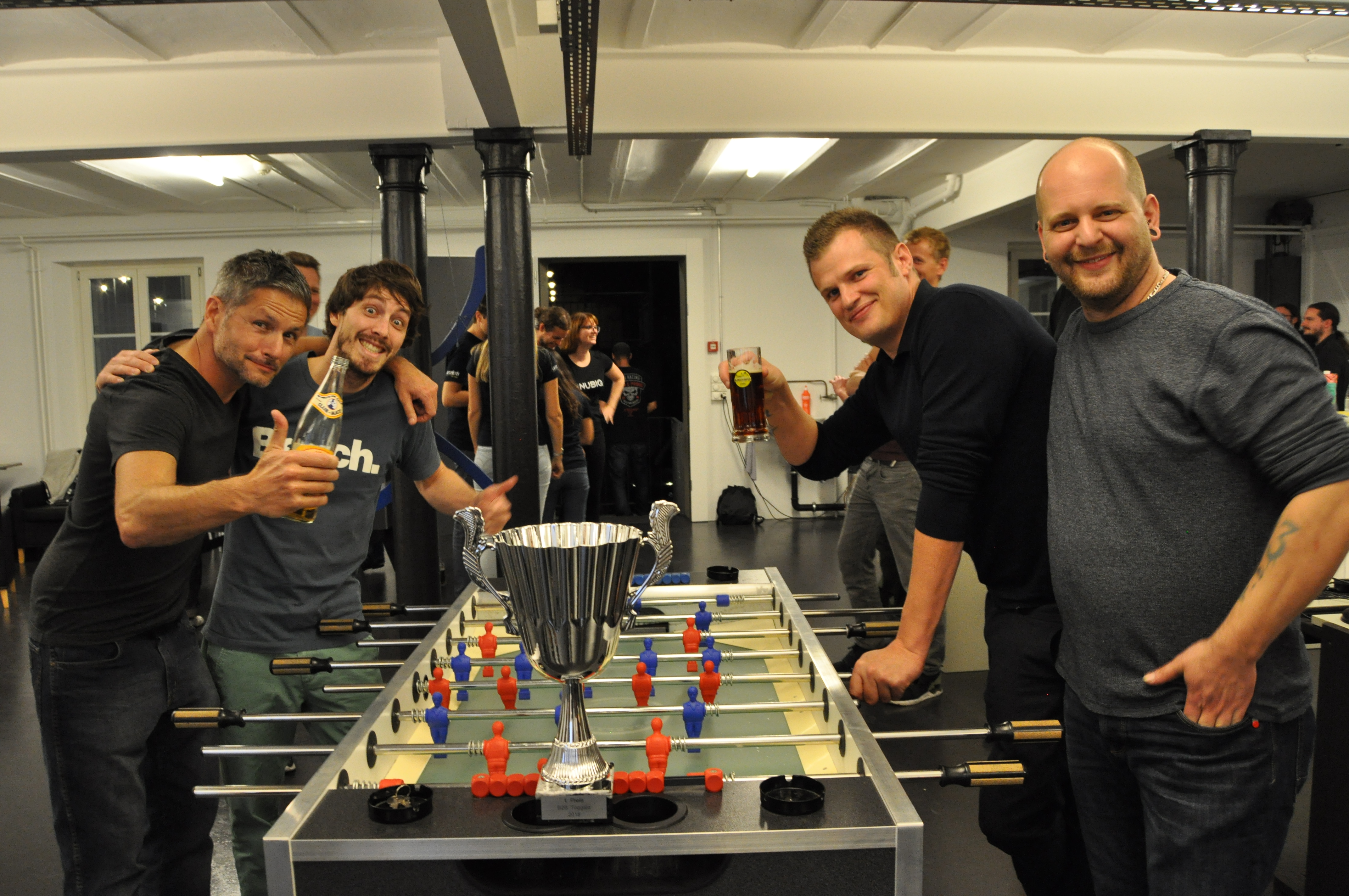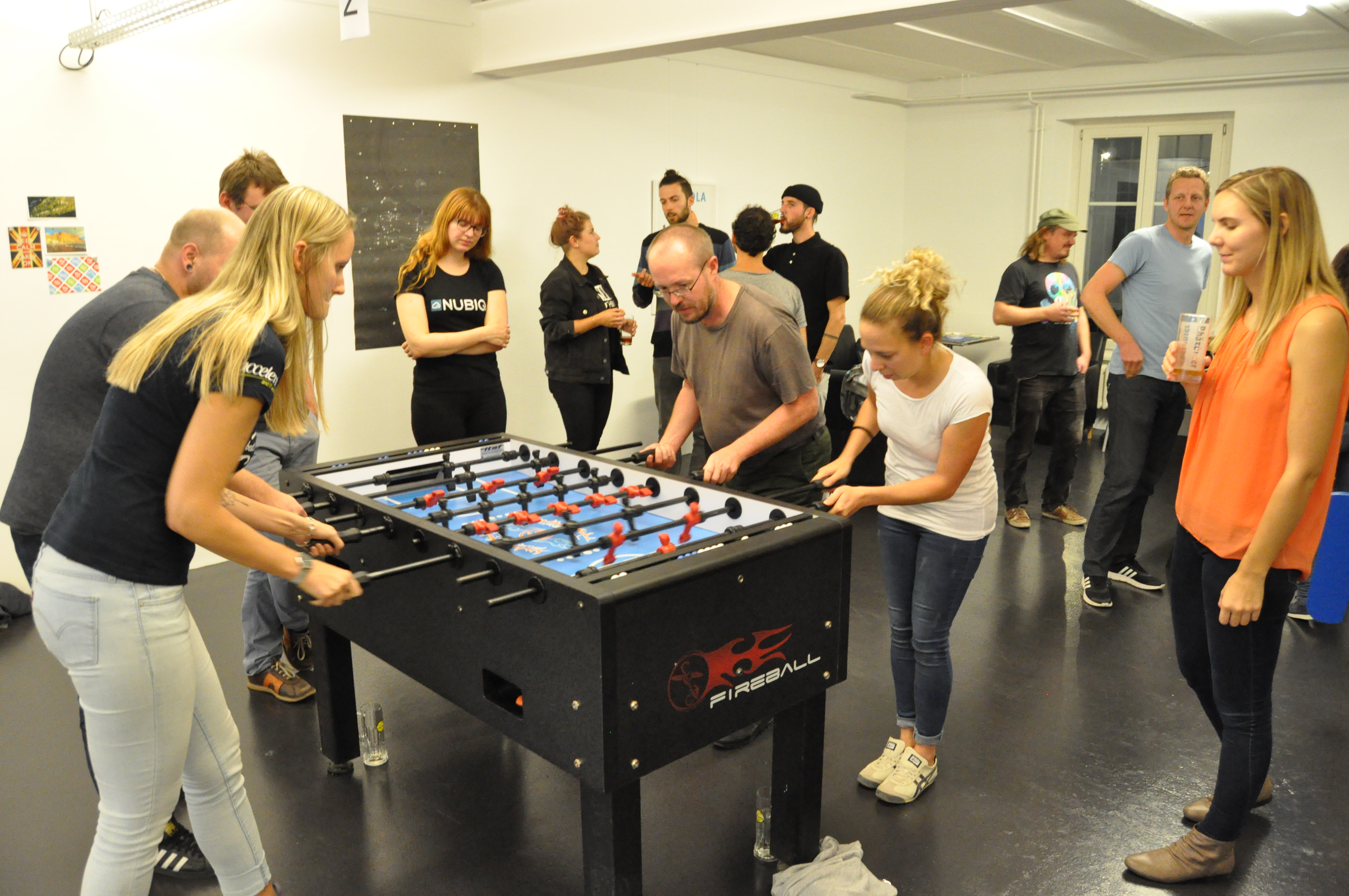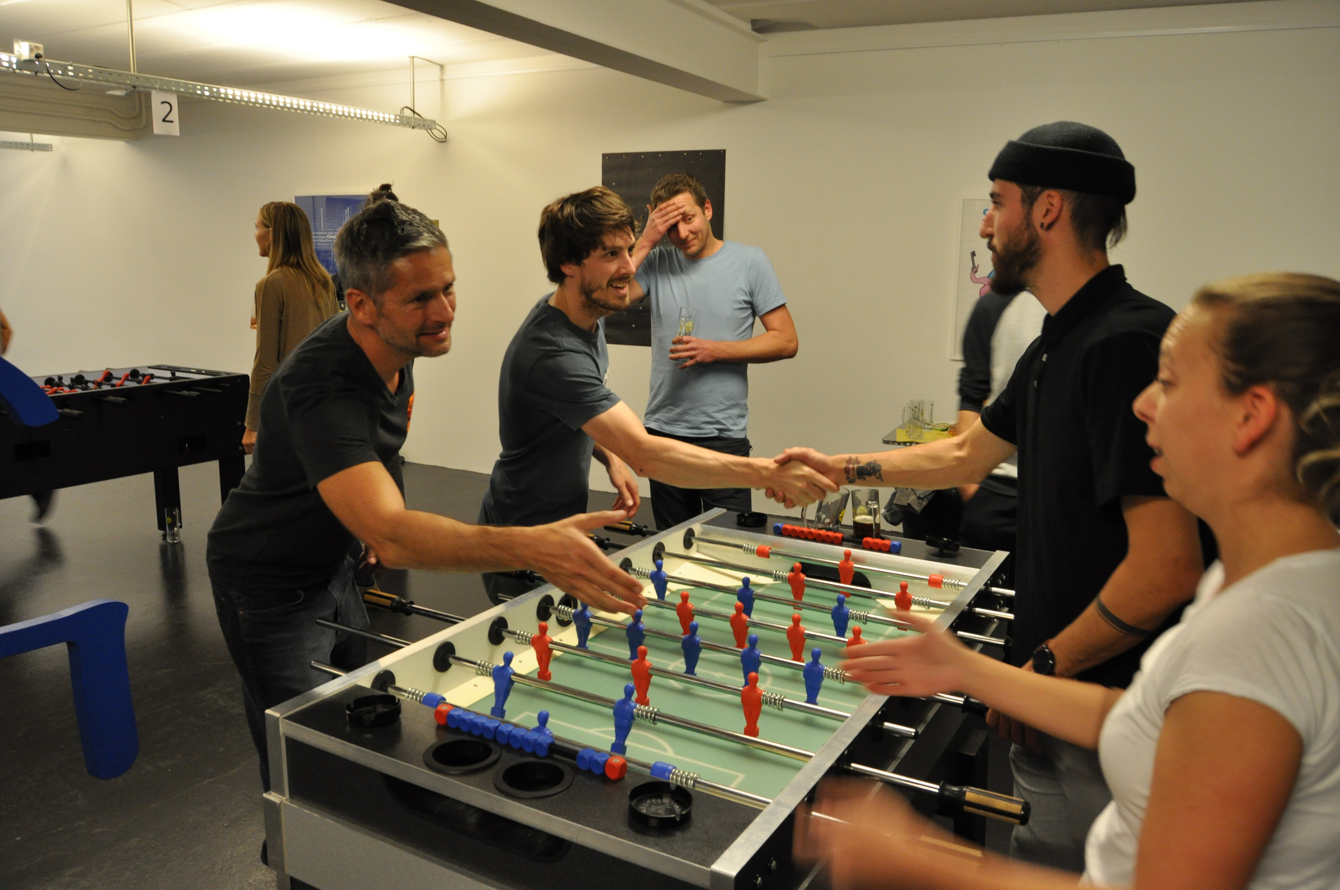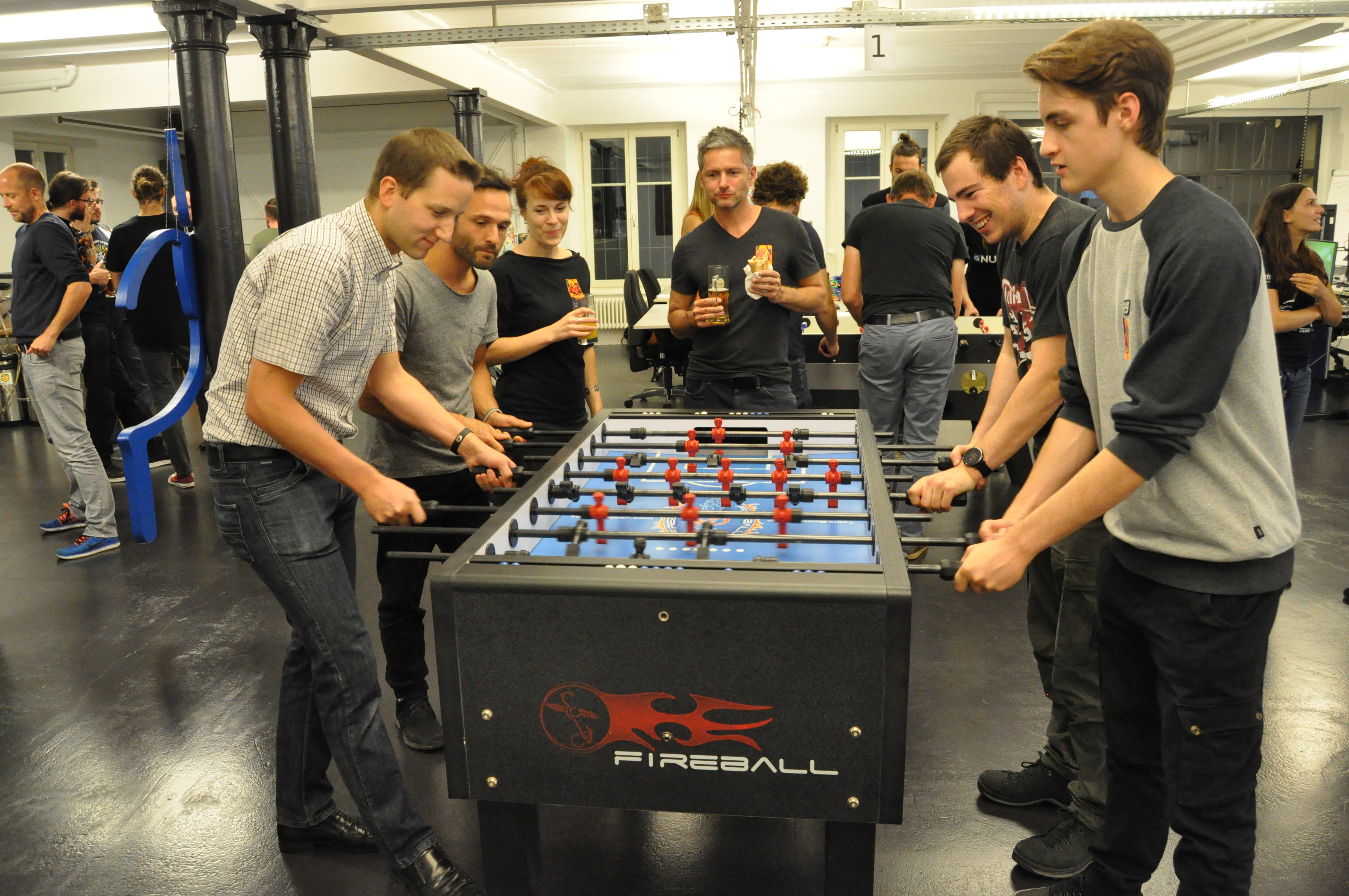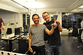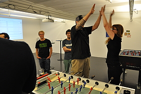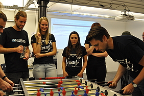 Organised by the companies Giessform Atelier für Kommunikationsdesign GmbH and stepping stone GmbH, the second business to business table football was a success. With over 30 participants from 20 companies the games started at 18:30 h. With 3 tables the tournament went into the first round. The teams were put together by a random generator every round. Exciting games and hot dogs turned the event for fans and spectators into an interesting evening as well.
