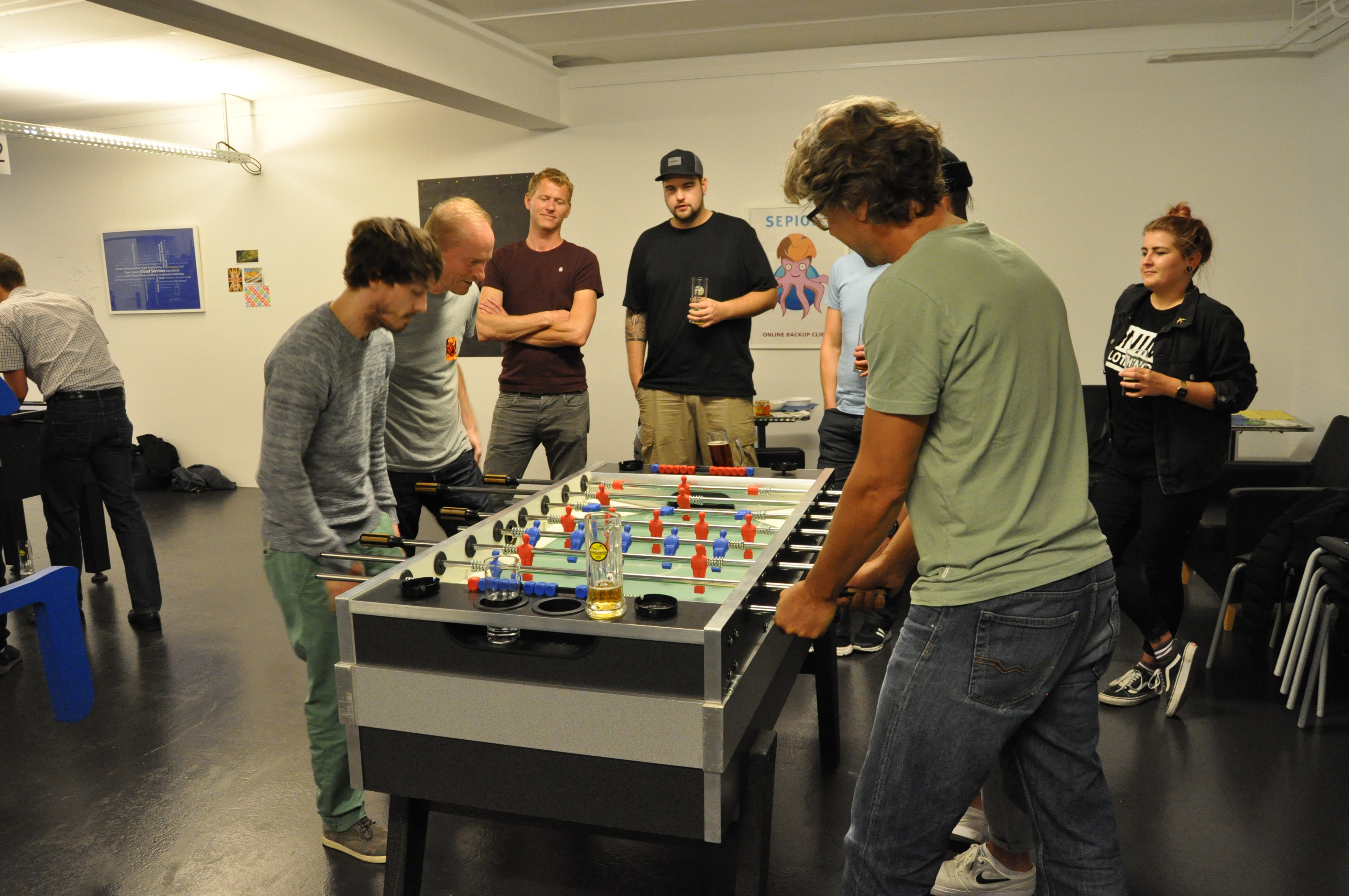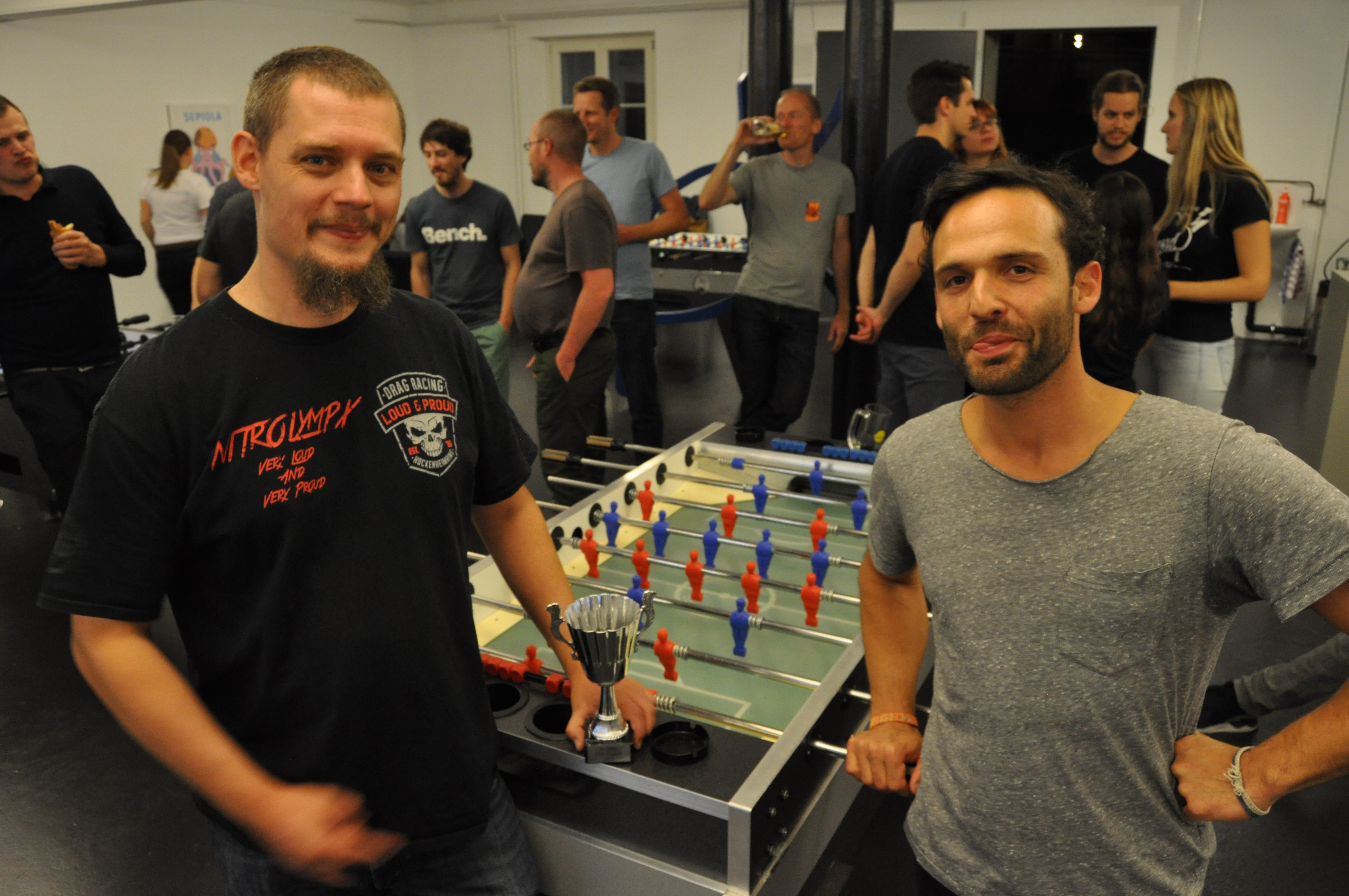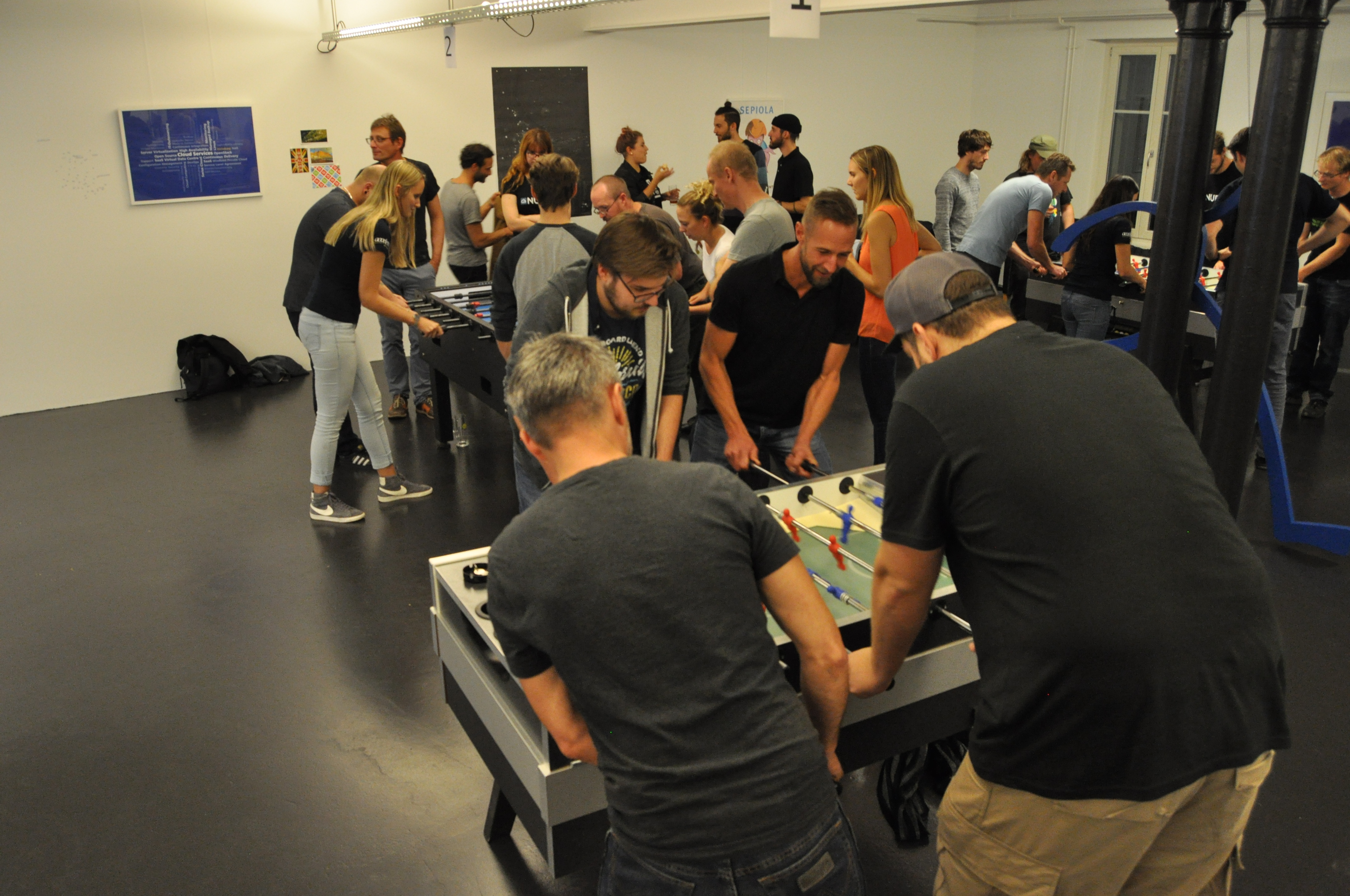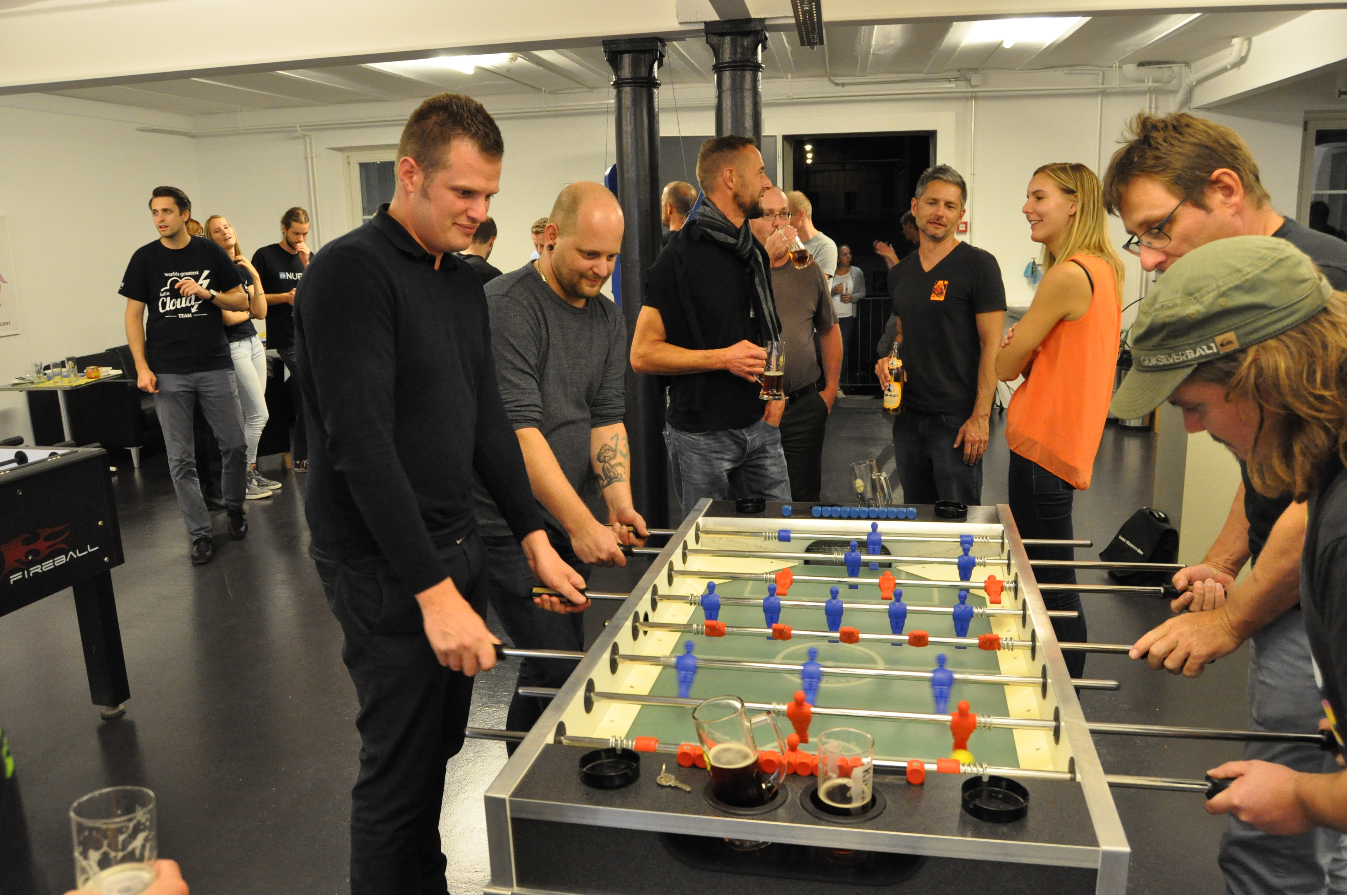 Organised by the companies Giessform Atelier für Kommunikationsdesign GmbH and stepping stone GmbH, the second business to business table football was a success. With over 30 participants from 20 companies the games started at 18:30 h. With 3 tables the tournament went into the first round. The teams were put together by a random generator every round. Exciting games and hot dogs turned the event for fans and spectators into an interesting evening as well.
