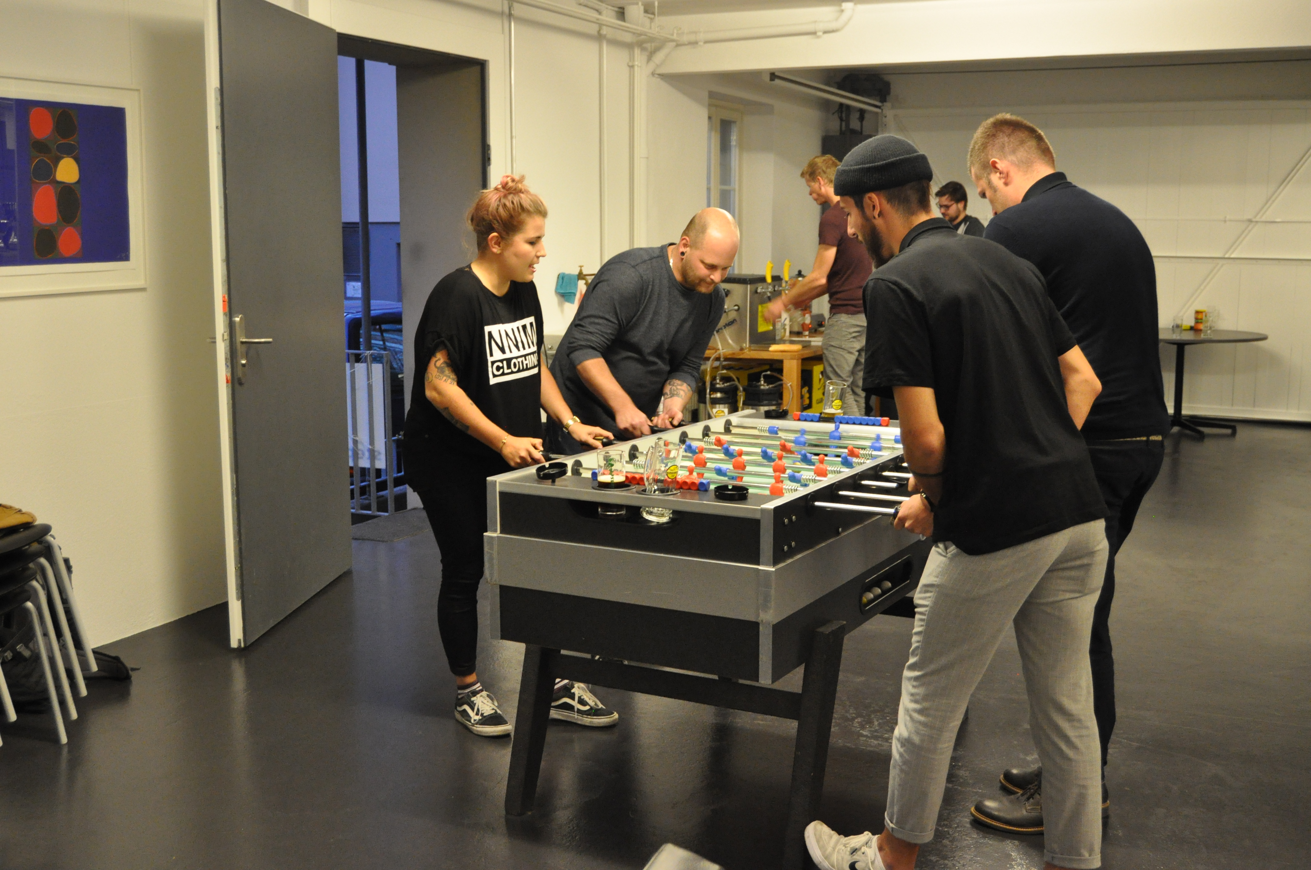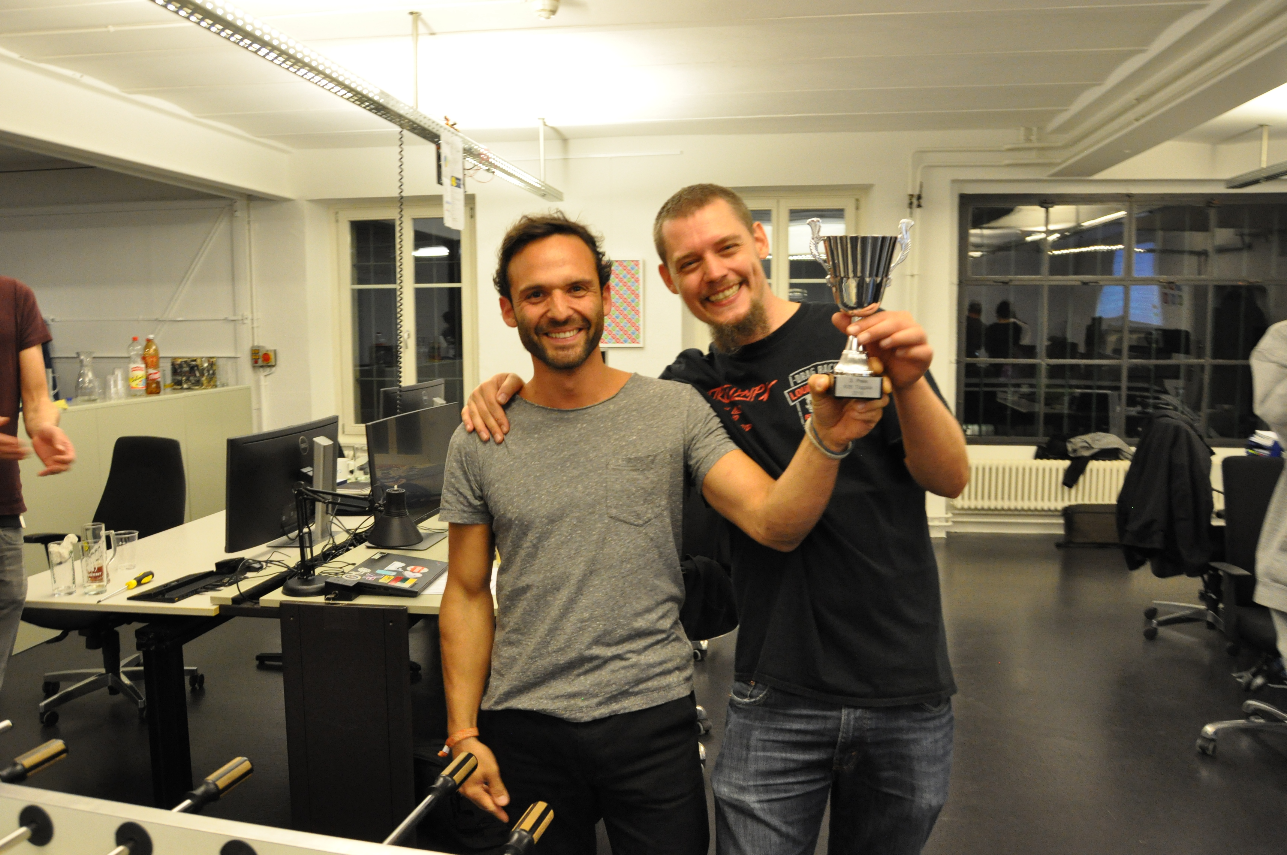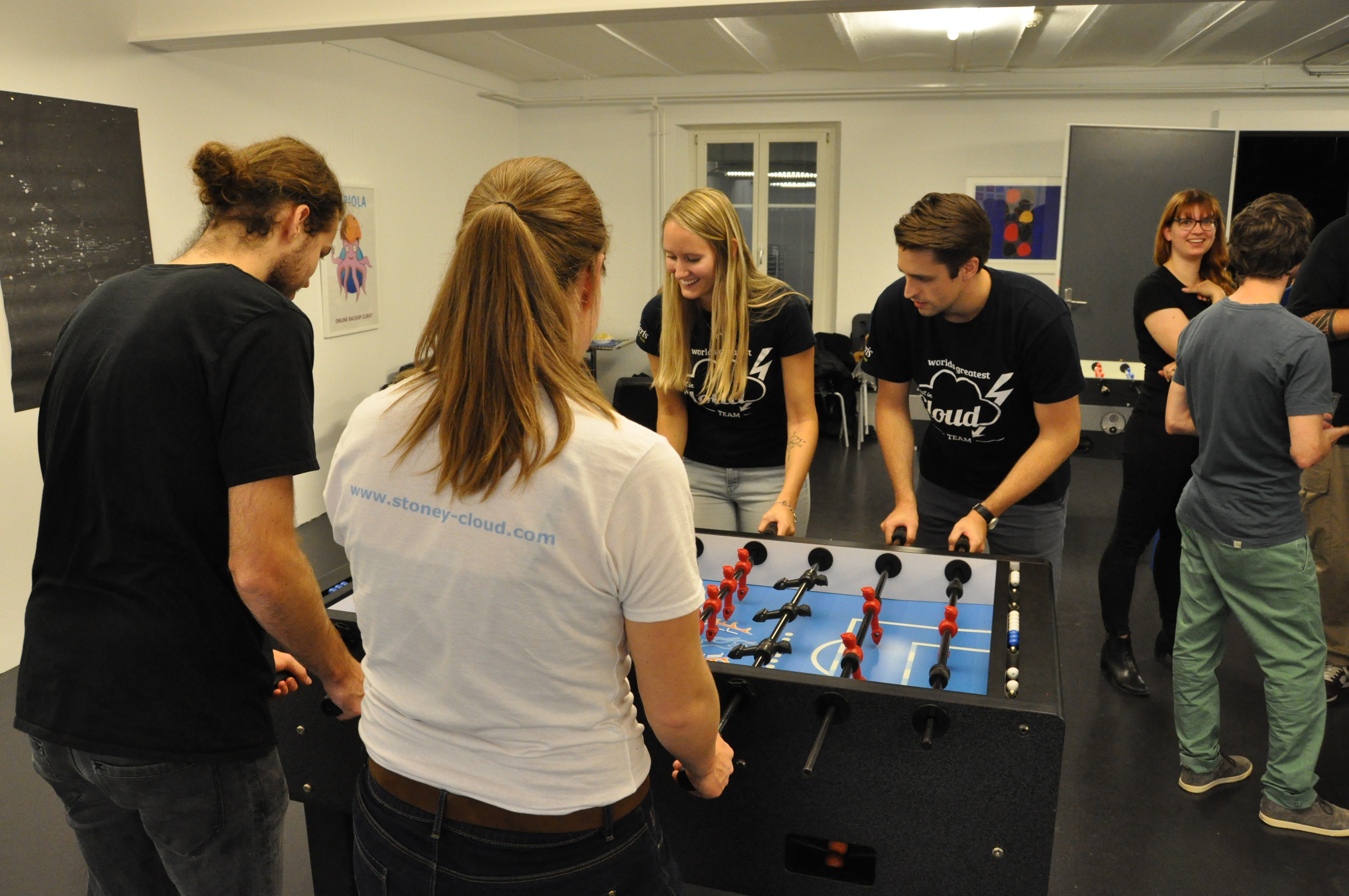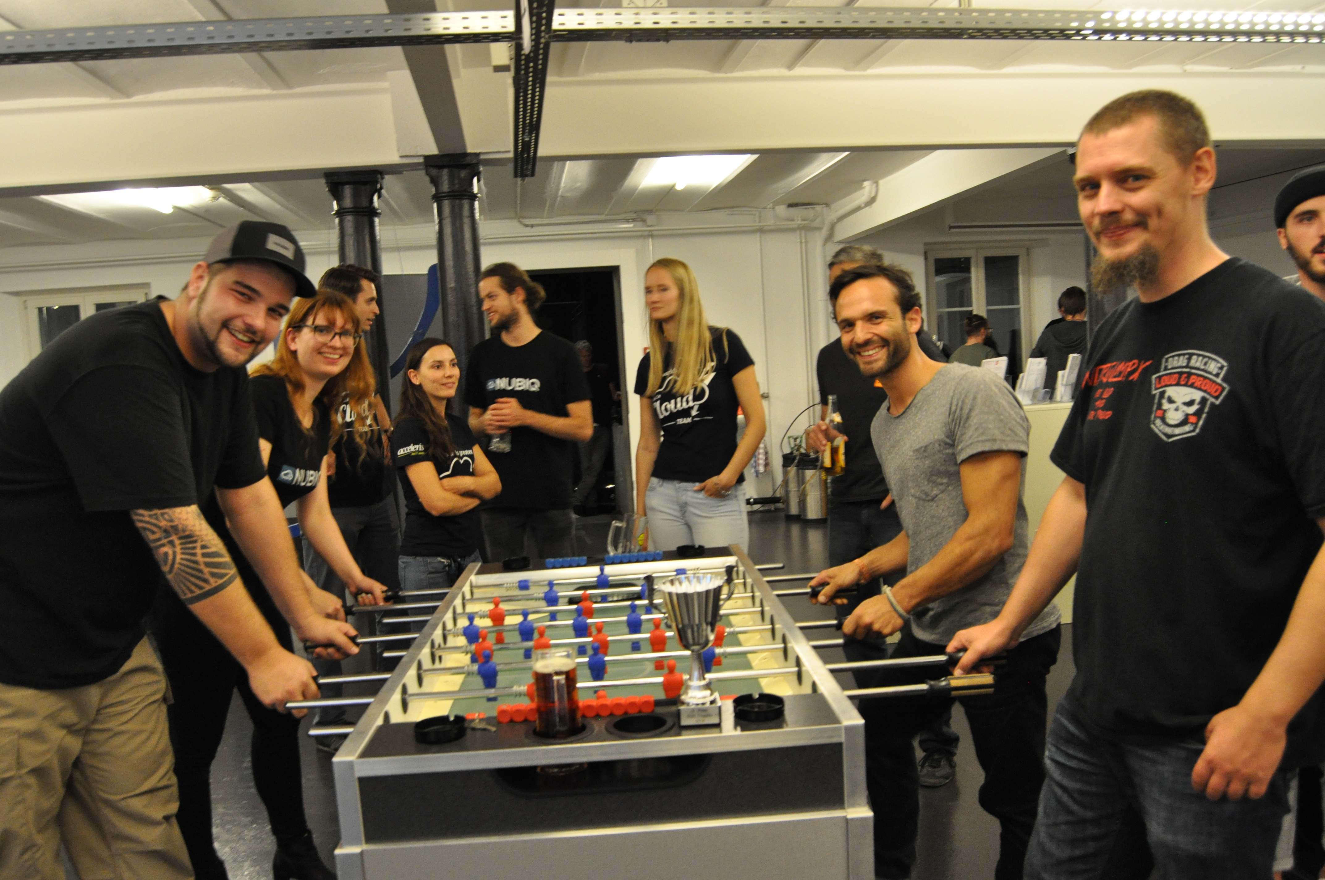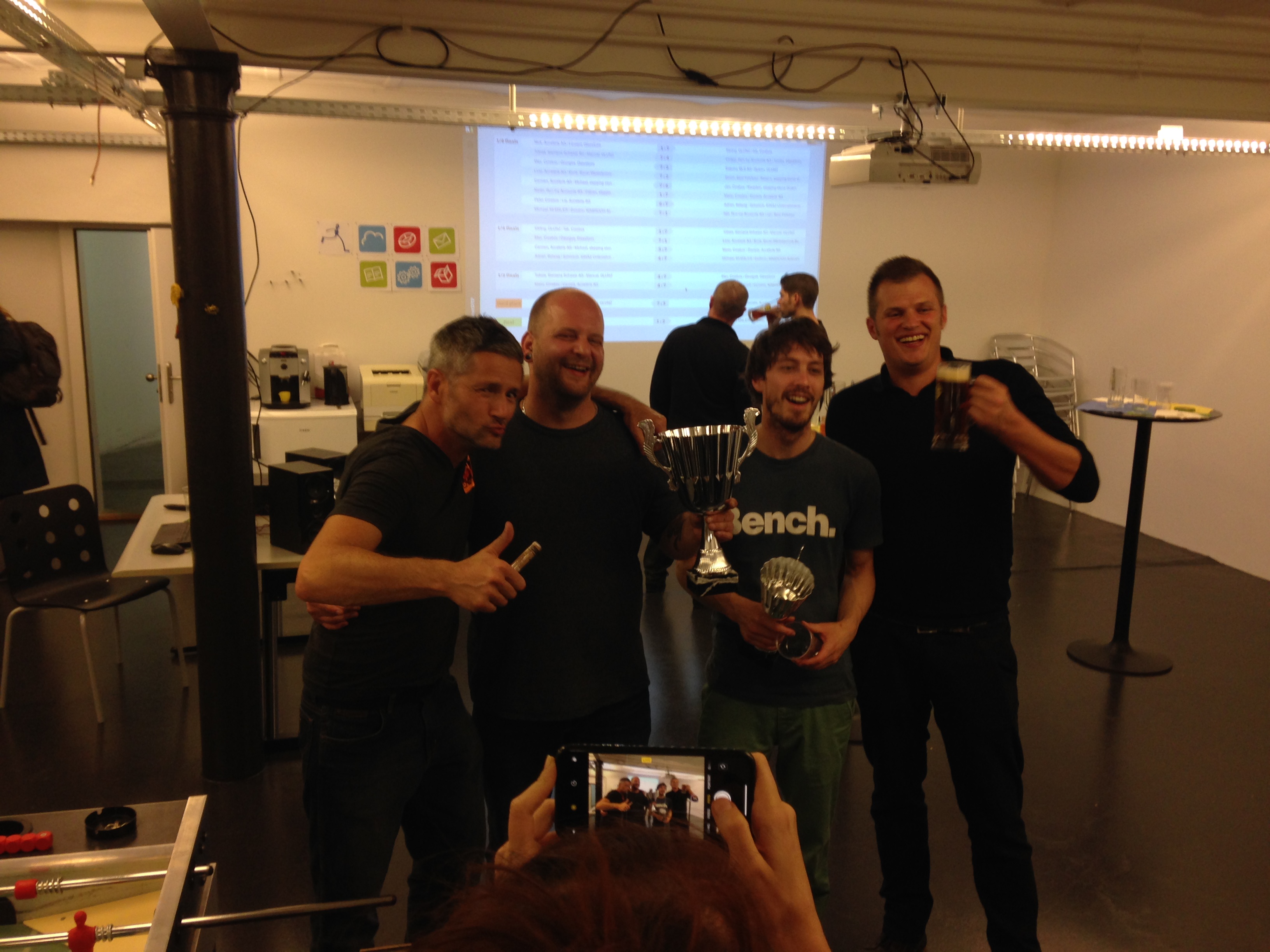 Organised by the companies Giessform Atelier für Kommunikationsdesign GmbH and stepping stone GmbH, the second business to business table football was a success. With over 30 participants from 20 companies the games started at 18:30 h. With 3 tables the tournament went into the first round. The teams were put together by a random generator every round. Exciting games and hot dogs turned the event for fans and spectators into an interesting evening as well.
