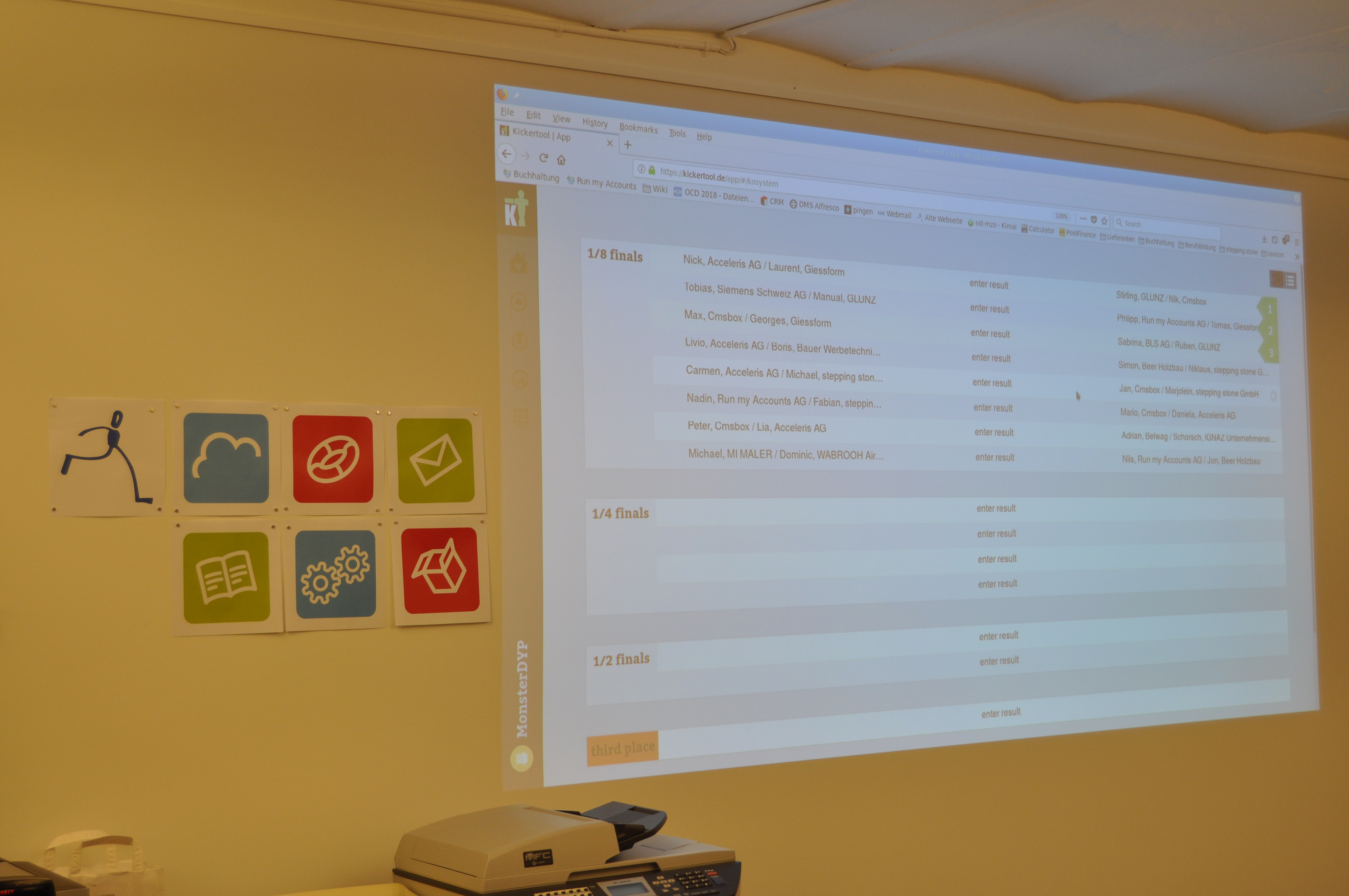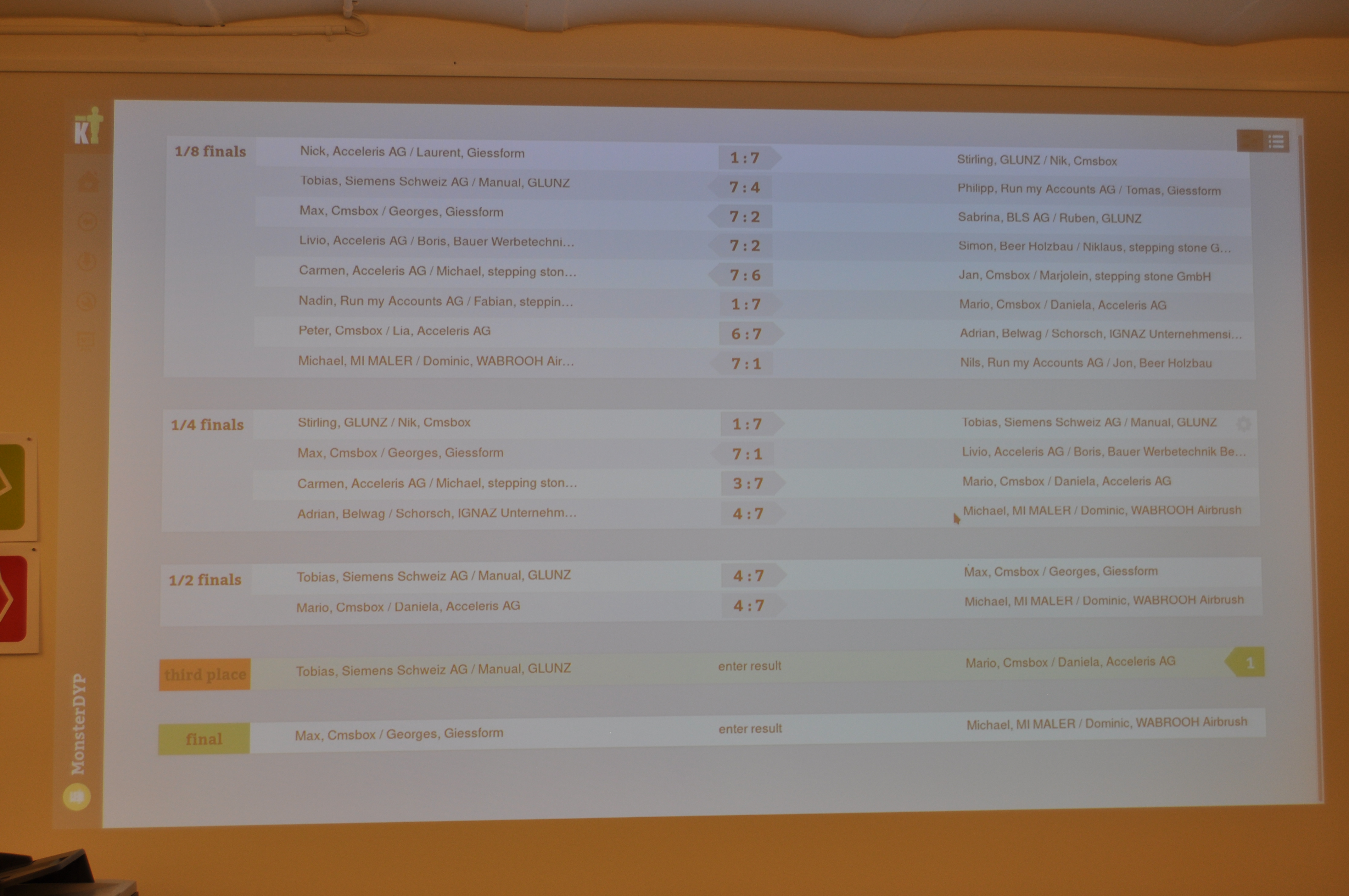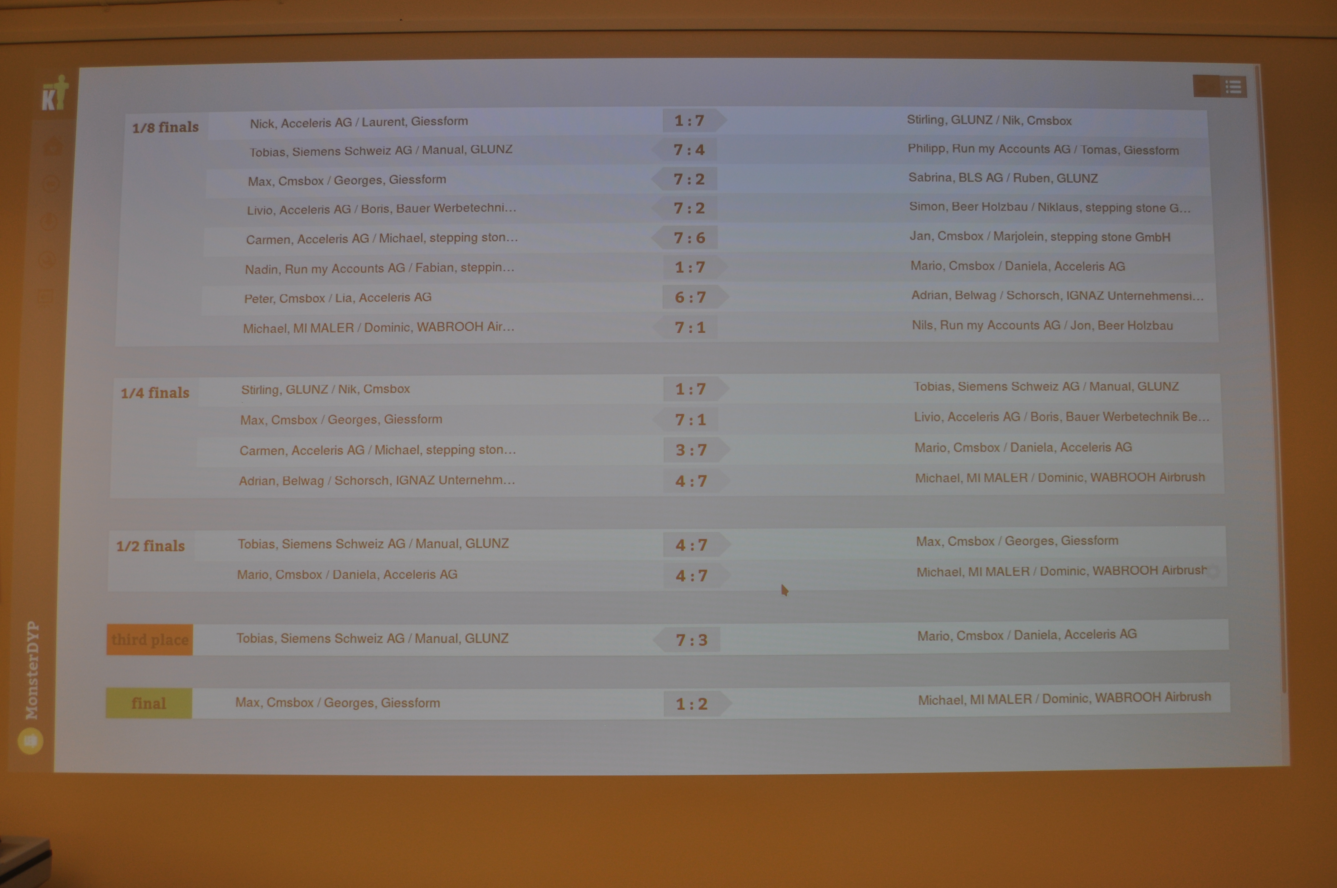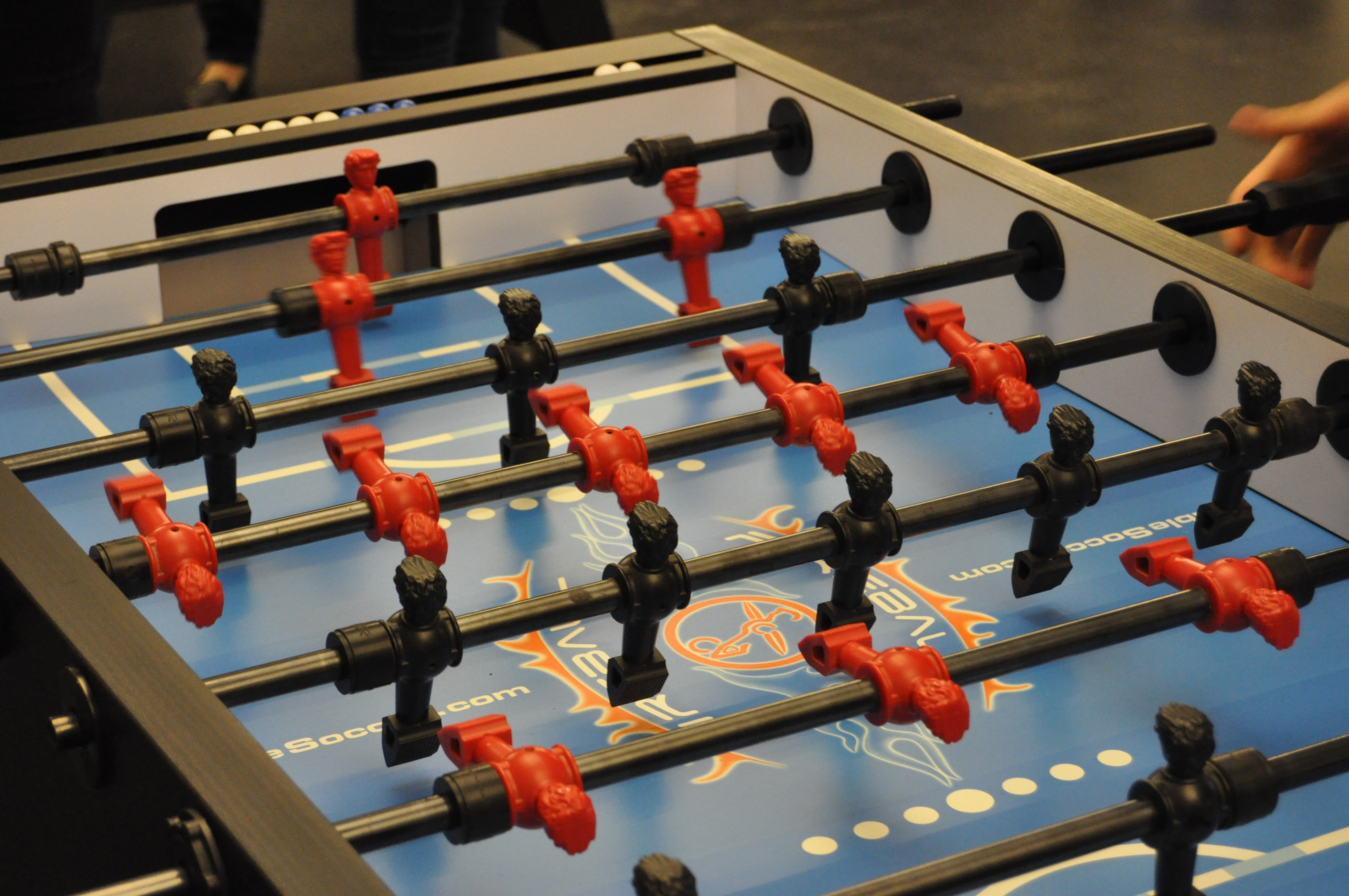 Organised by the companies Giessform Atelier für Kommunikationsdesign GmbH and stepping stone GmbH, the second business to business table football was a success. With over 30 participants from 20 companies the games started at 18:30 h. With 3 tables the tournament went into the first round. The teams were put together by a random generator every round. Exciting games and hot dogs turned the event for fans and spectators into an interesting evening as well.