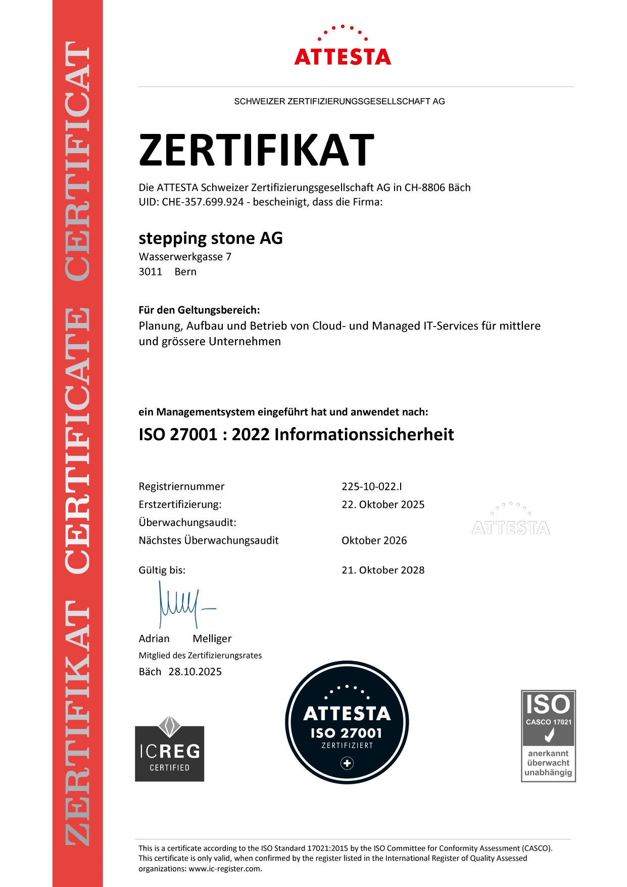 Die stepping stone AG ist seit Oktober 2019 nach ISO/IEC 27001:2013 zertifiziert. Im Herbst 2024 wurde das Transition Audit auf ISO/IEC 27001:2022 erfolgreich abgeschlossen. Im Oktober 2025 wurde die stepping stone AG erfolgreich durch die ATTESTA Schweizer Zertifizierungsgesellschaft AG rezertifiziert.
